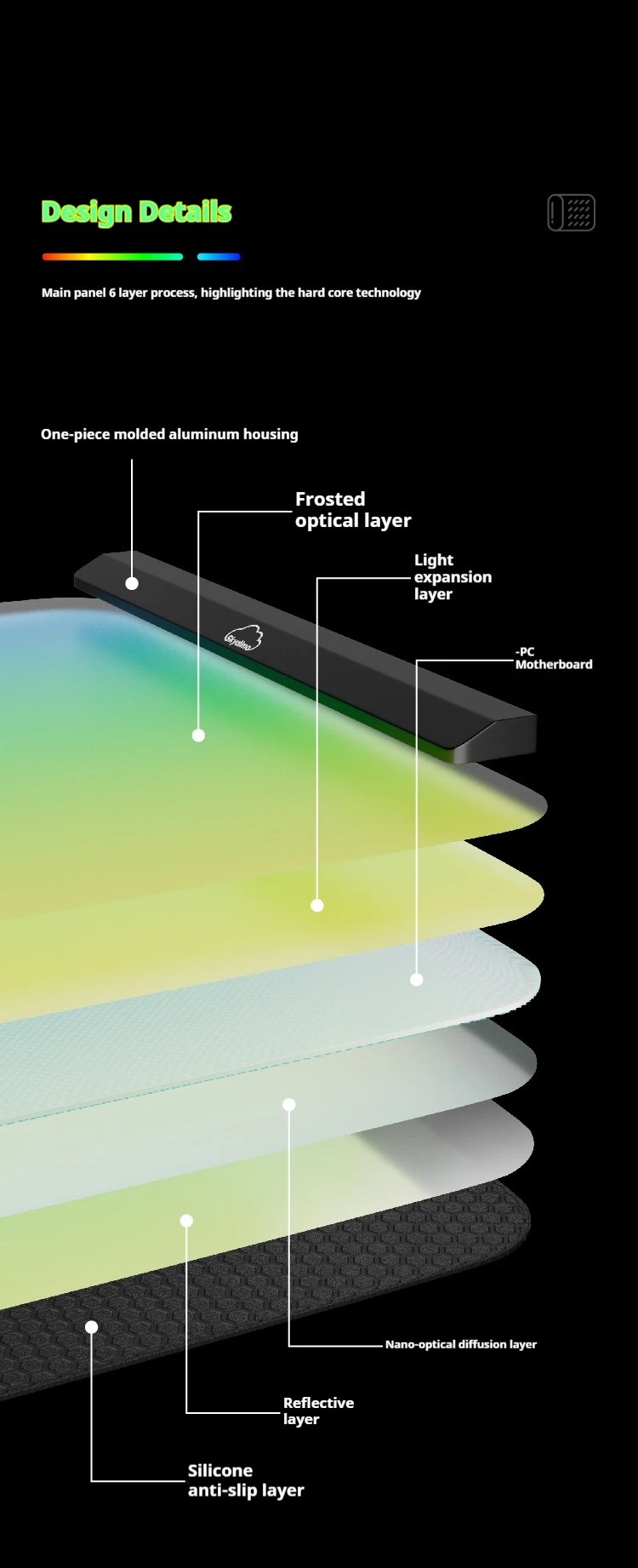 Fully illuminated RGB Mousepad: The special materials and frosted surface of this mouse mat is capable of capturing and projecting the best effect of the LED strip, ensure that the RGB light can be fully illuminated to the entire surface of the mouse pad gaming, achieving vivid and dazzling illumination.